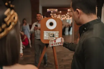 - Stylowy, drewniany/retro wygląd fotobudki pasujący do klimatu imprezy